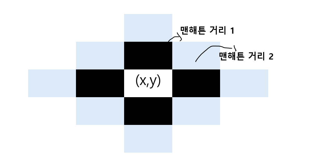 - 주목할 점은 맨해튼 거리 2에 도달하려면 먼저 맨해튼 거리 1(상하좌우)을 거쳐야 한다는 것이다.