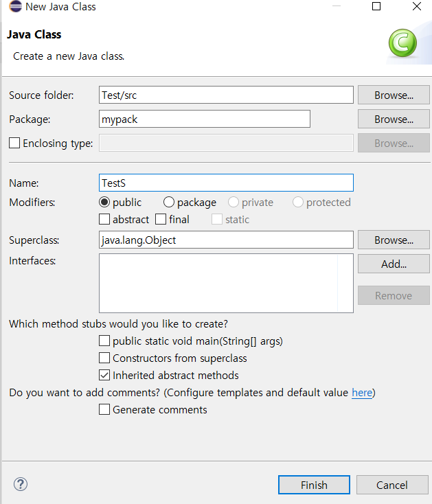 - 생성된 소스 코드 (TestS.java)와 소스 코드 내의 클래스명(TestS)은 동일