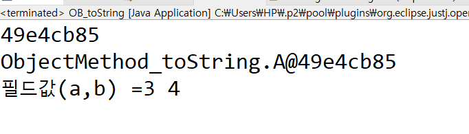 - 클래스 B에서 오버라이딩한 toString메서드에서는 자신의 필드 2개의 값을 출력하는 문자열을 리턴
