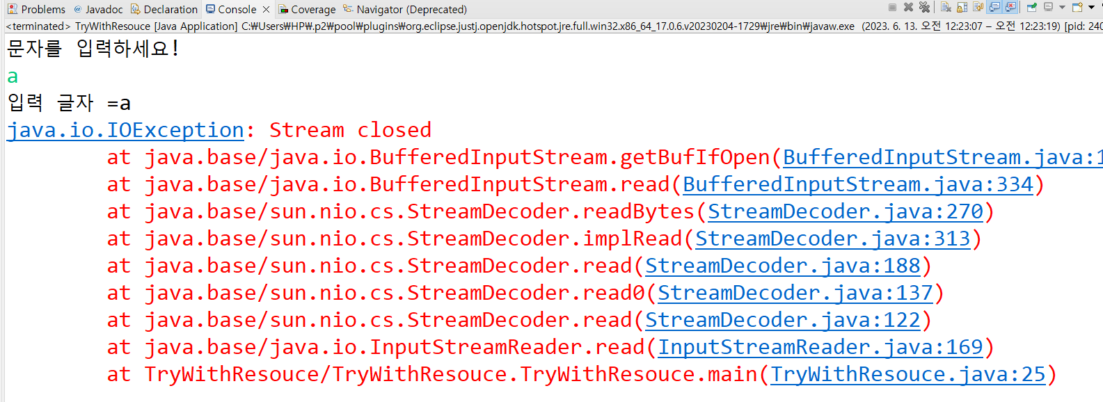 - try- catch 구문을 끝낼 때 리소스를 해제하기 때문에 이후에는 콘솔 입력을 사용할 수 없게 됨