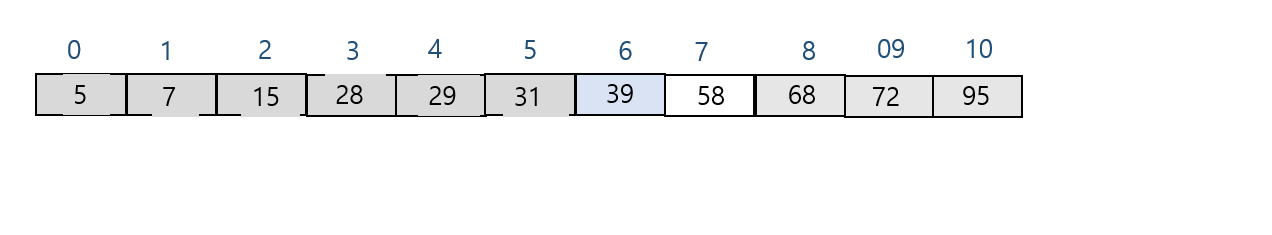- 검색값 39는 중앙 요소 a[5](31)보다 큰값 ( 뒤쪽에 존재)