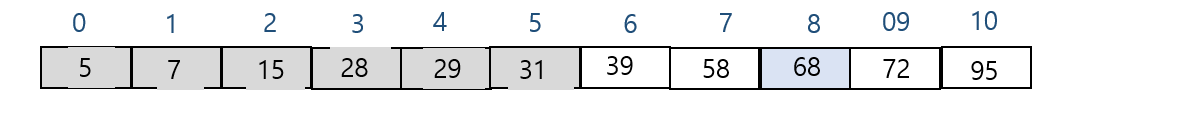 - 검색값 39는 중앙 요소 a[8](68)보다 작은 값 (앞쪽에 존재)