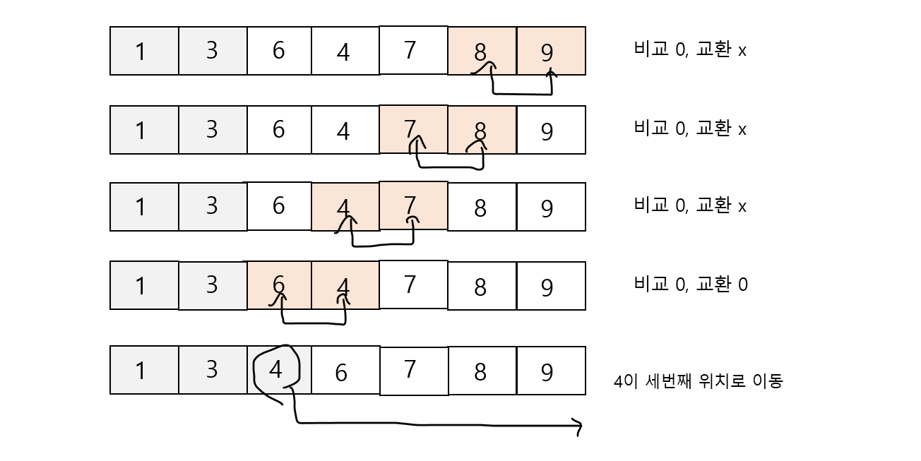 - 마지막 교환 이후의 {1,3,4}는 정렬을 마친 상태