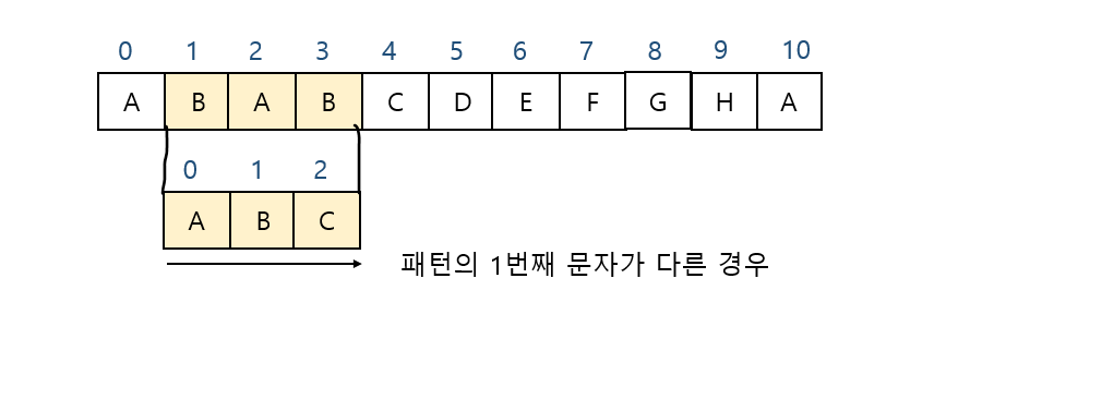 ex) "ABABCDEFGHA"에서 패턴 "ABC"를 브루트- 포스법을 사용하여 검색