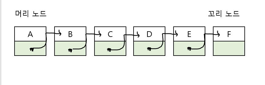 - 각각의 노드는 데이터와 다음 노드를 가리키는 포인터를 가짐