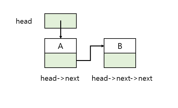 - 머리 포인터 list->head가 가리키는 노드 A의 next는 노드 B를 가리킴