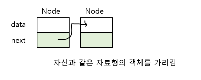 - 자기 자신과 같은 자료형의 객체를 가리키는 데이터가 내부에 포함