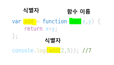 - 함수 이름은 함수 몸체 내부에서만 유효한 식별자 이므로 함수이름과는 별도로 생성된 함수 객체를 가리키는 식별자가 필요