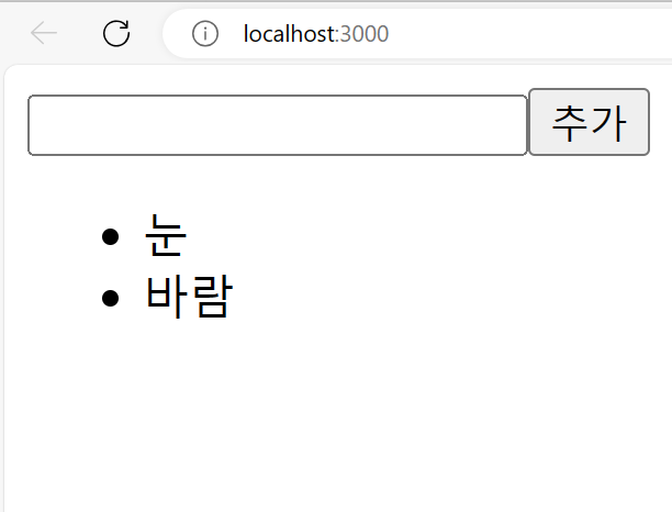 - onClick에서 새로운 항목을 추가할 떄 객체의 id 값은 nextId를 사용하도록 하고, 클릭될떄 마다 값이 1씩 올라가도록 구현 - button이 클릭될 떄 기존의 input 내용을 비우는 것도 구현