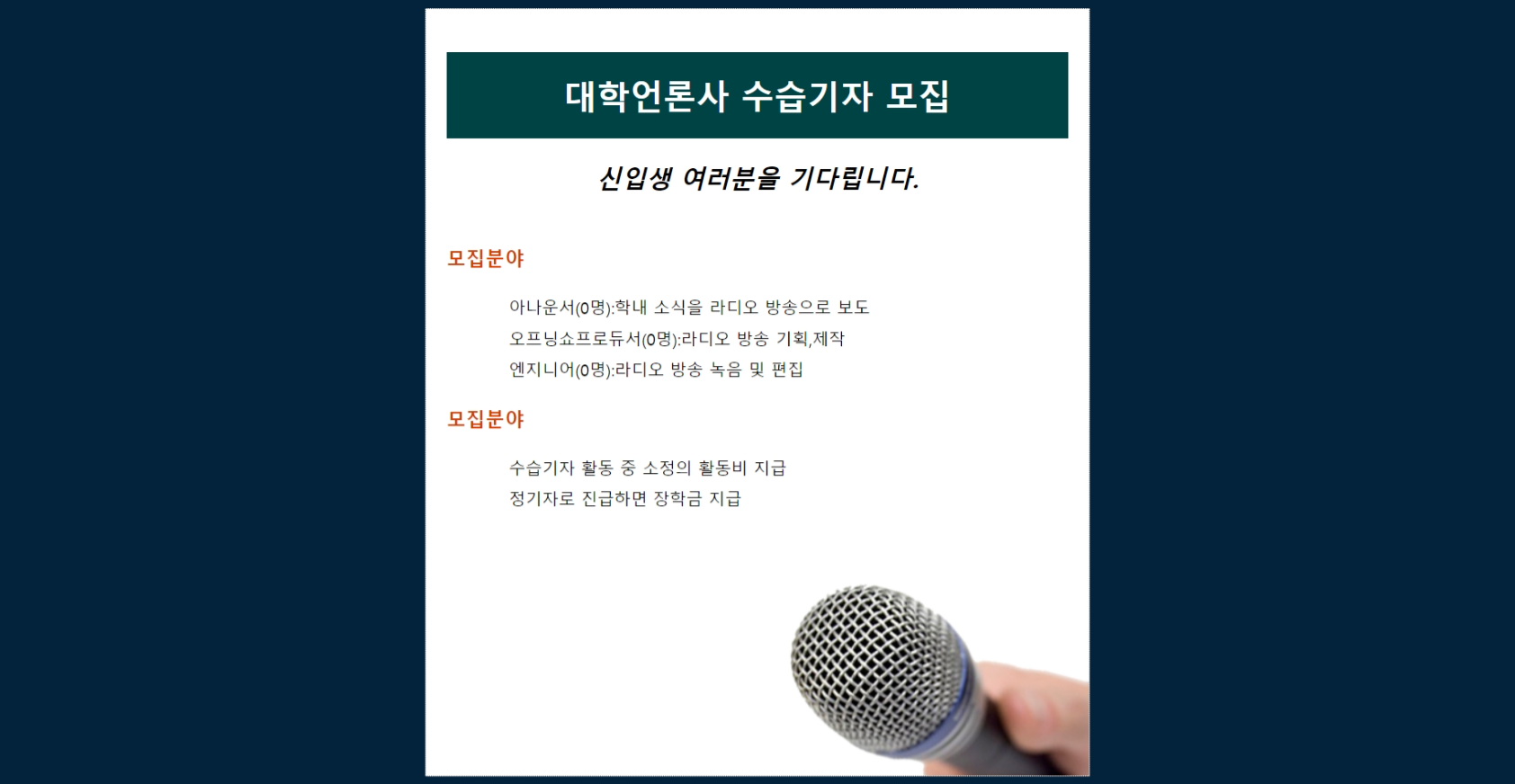 <li>아나운서(0명):학내 소식을 라디오 방송으로 보도</li>