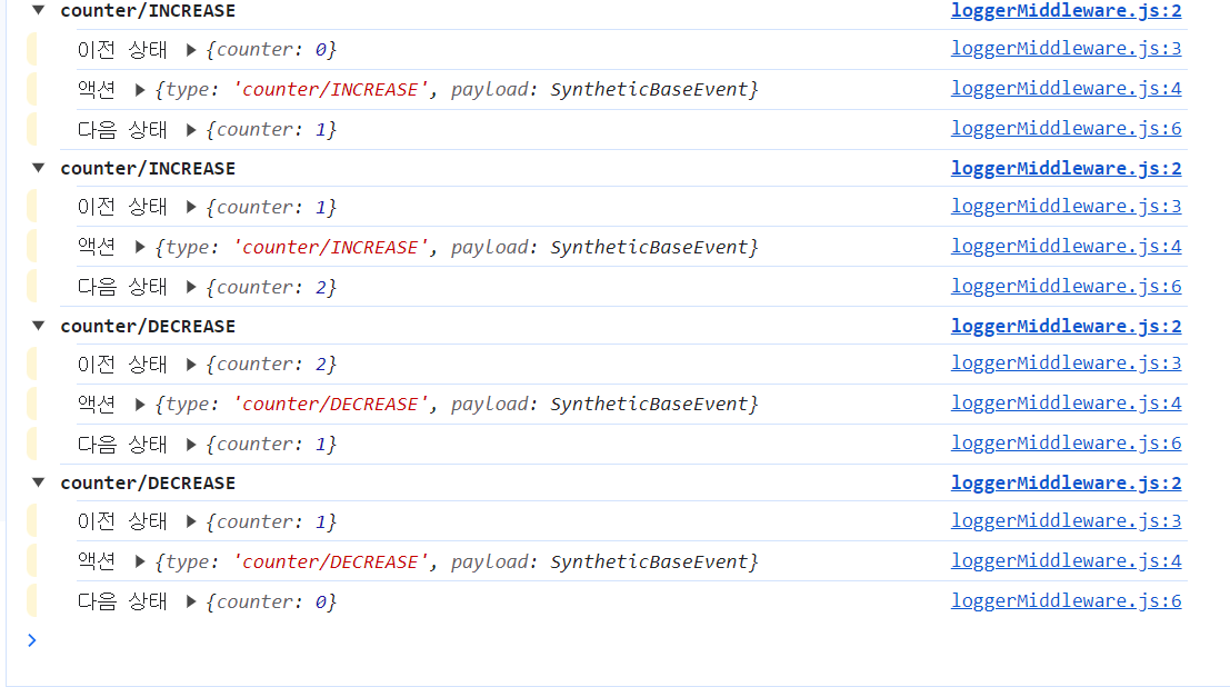 - 액션이 디스패치될 때마다 액션의 정보와 액션이 디스패치되기 전후의 상태를 콘솔에 보여주는 로깅 미들웨어 작성