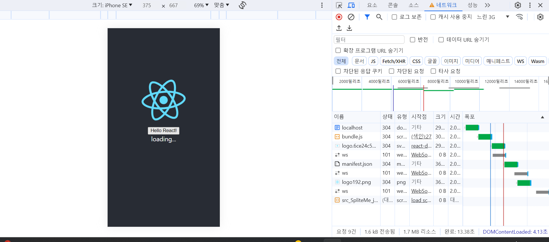 - Hello React!를 클릭하는 시점에 새로운 자바스크립트 파일을 불러옴