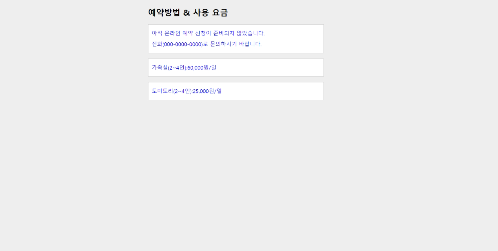 <p>아직 온라인 예약 신청이 준비되지 않았습니다.<br>전화(000-0000-0000)로 문의하시기 바랍니다.</p>