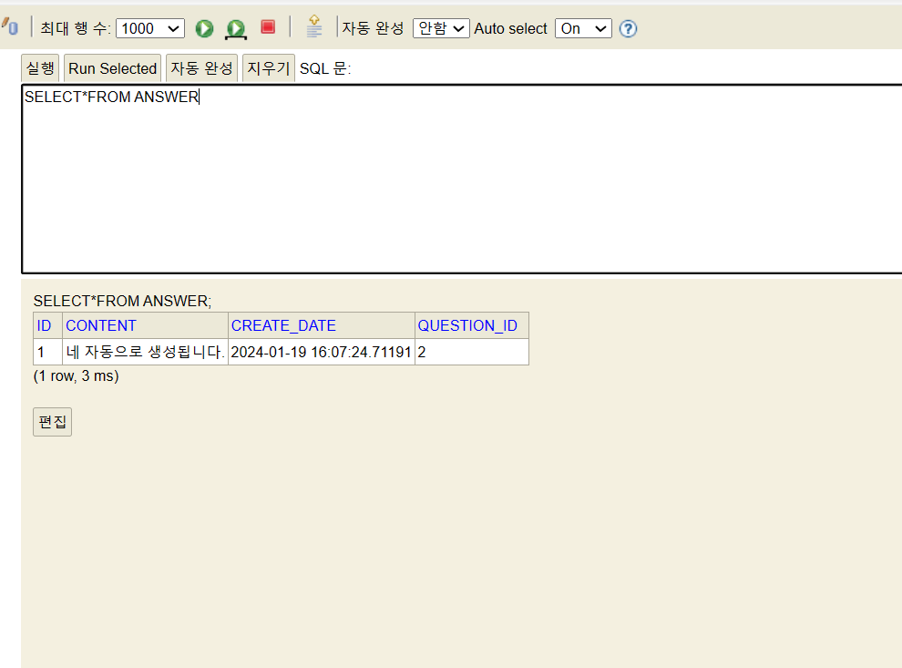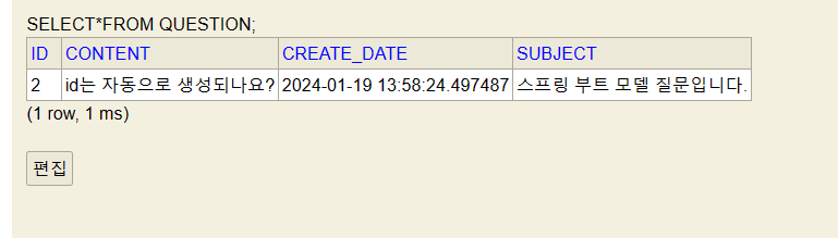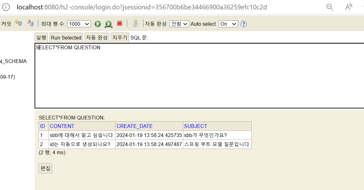 - H2 콘솔에 접속하여 Select * From Question 쿼리문 실행