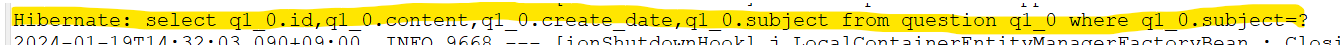 - findBySubject 메서드를 호출할 때 실제 데이터베이스에서는 어떤 쿼리문이 실행되는지 콘솔 로그에서 확인