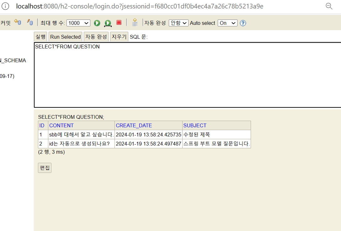 | 2 | id는 자동으로 생성되나요? | 2024-01-09 -13:57:00.... | 스프링부트 모델 질문입니다. |