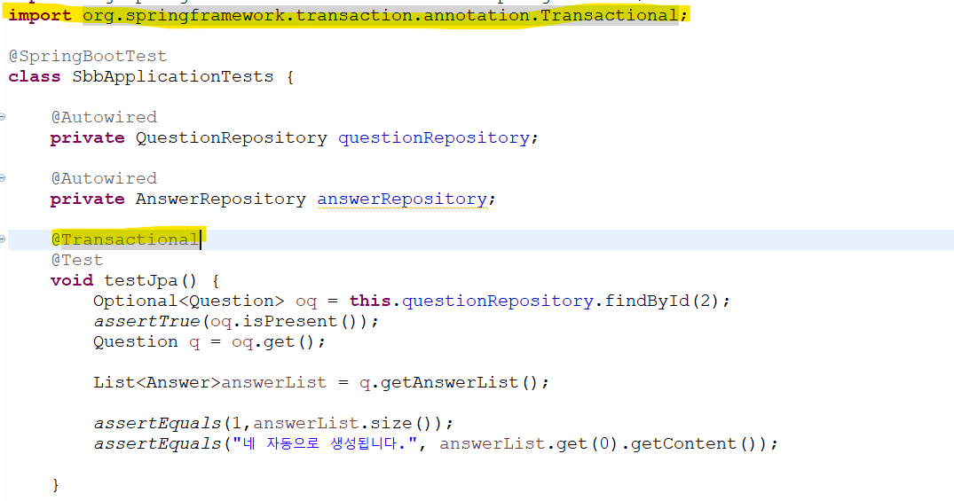 - @Autowired를 통해 스프링의 '의존성 주입(DI)'를 사용하여 QuestionRepository의 객체 주입