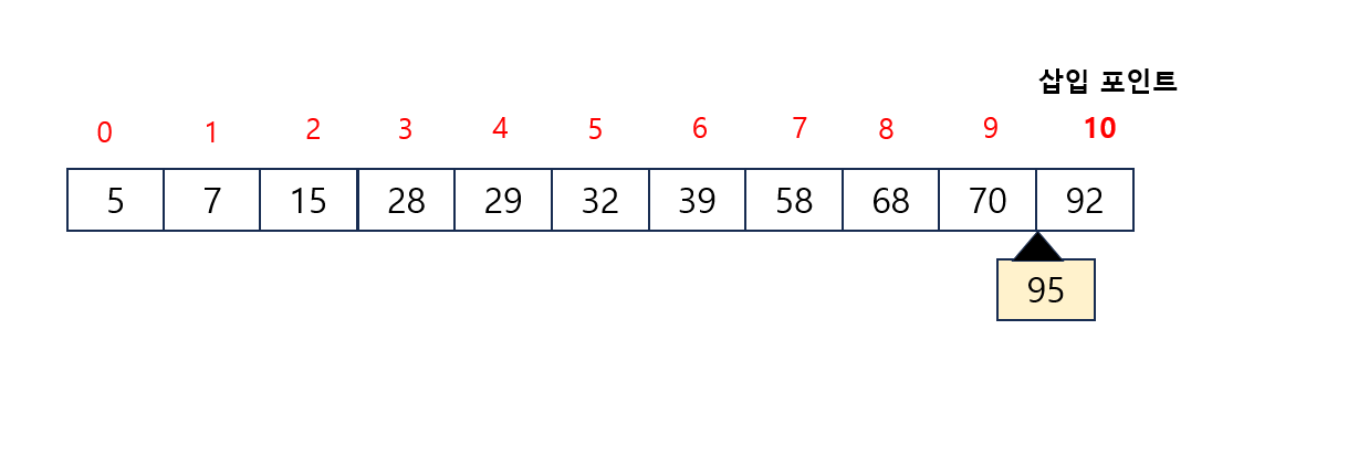 - 95를 검색하면 모든 요소가 검색하는 값보다 작기 때문에 삽입 포인트는 배열의 길이인 10이 됨