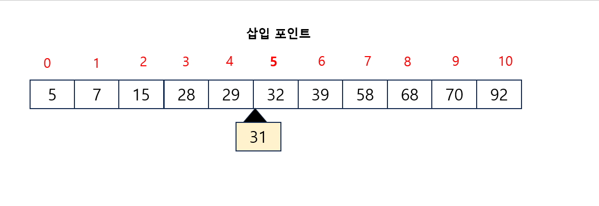 - 31을 검색하면 31은 인덱스(4)와 인덱스(5) 사이에 위치해야 하므로 삽입 포인트는 5