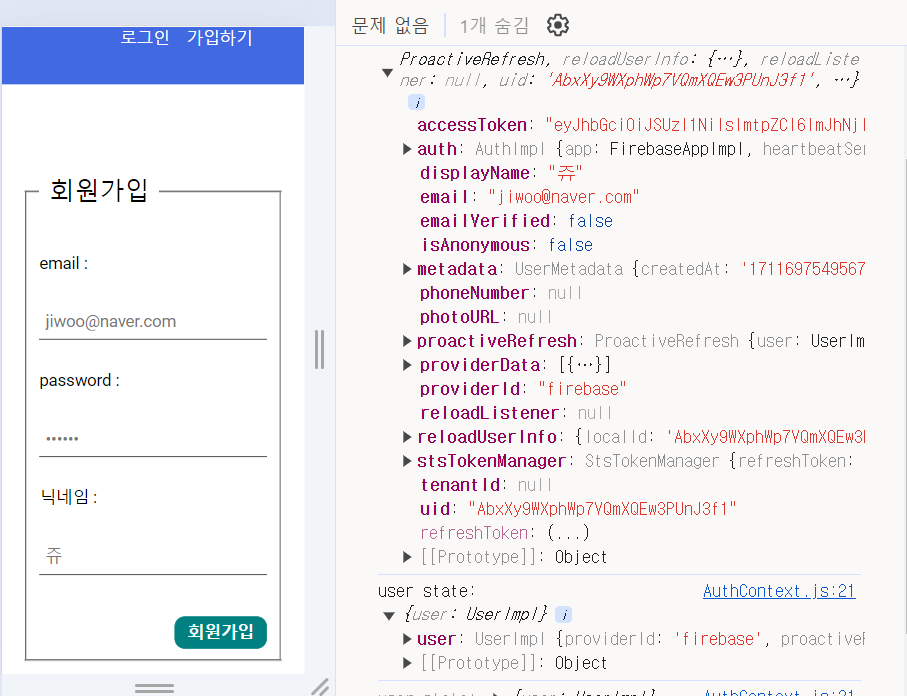 - 로그인이 된 회원의 정보는 나중에 사용할 firestore 같은 여러 firebase 서비스에서 이용이 가능하다.