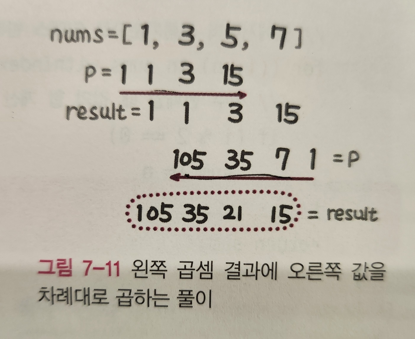 - 여기서 p는 1부터 시작해 차례대로 오른쪽 곱셈 결과로 1,7,35,105가 되고 최종적으로 이 값이 왼쪽 곱셈 결과에 뒤부터 곱해지면서 result 변수에는 정답인 [105,35,21,15]가 담긴다.