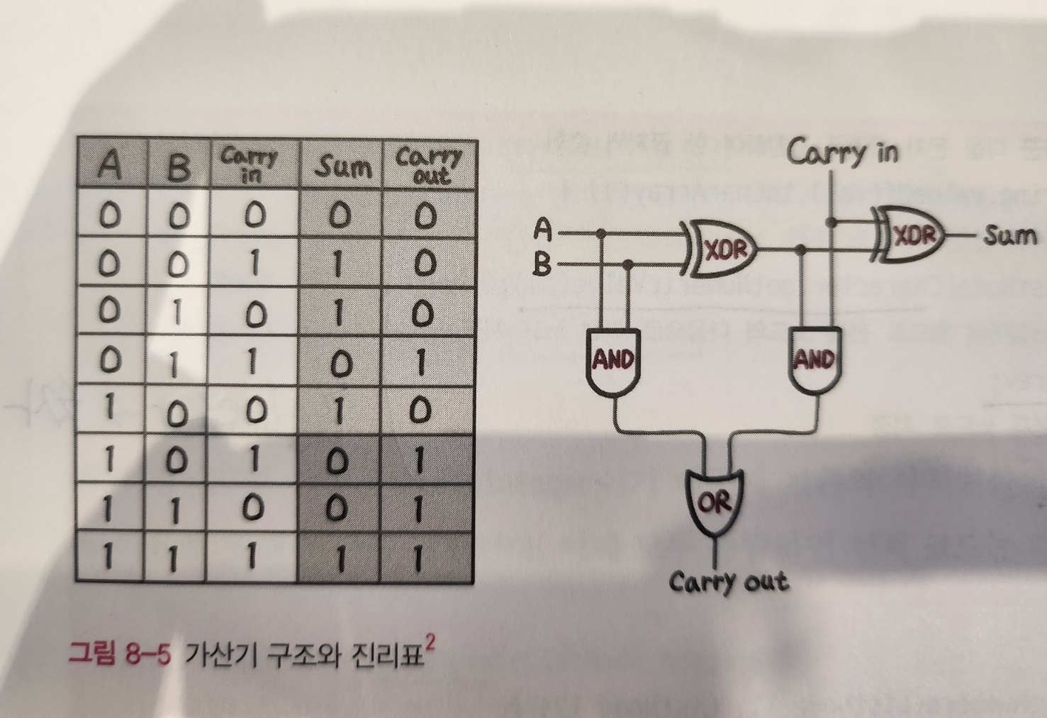 - 입력 값 A와 B, 이전의 자리 올림수(Carry in) 이렇게 3가지 입력으로 합(Sum)과 다음 자리 올림수(Carry out) 여부를 결정