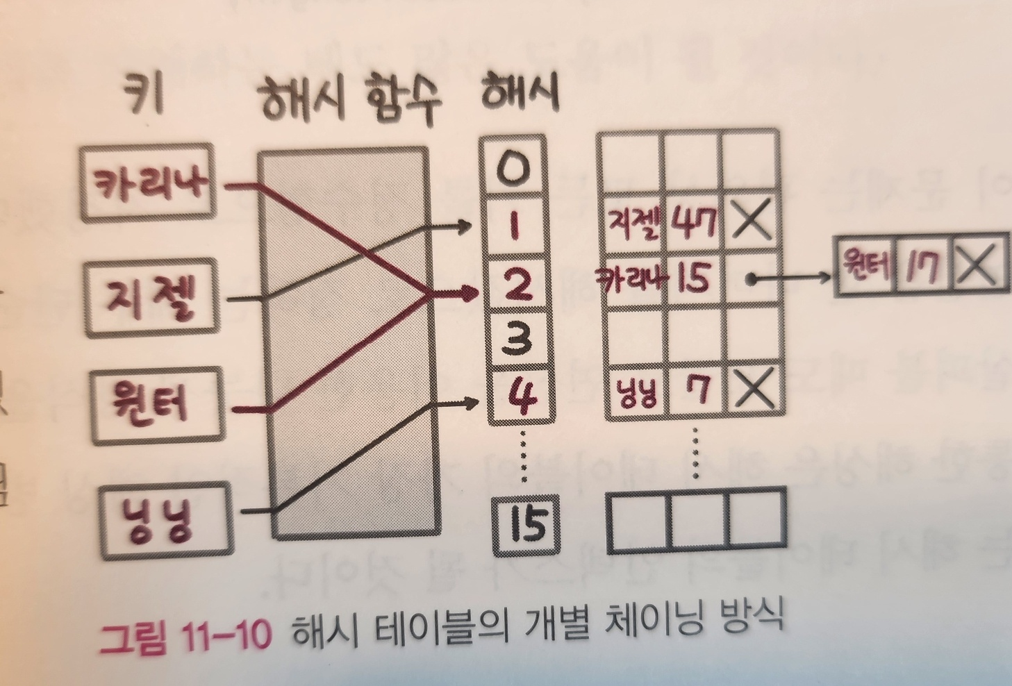 - 만약 인덱스가 일치하는 해시 충돌(Hash Collision)이 발생한다면 별도의 처리가 필요하다.