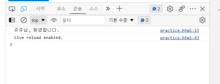 - 콘솔창 : 웹 브라우저의 개발자 도구 창에 포함되어 있는 공간