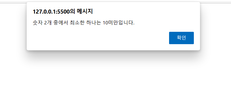 alert("숫자 2개 중에서 10 미만인 수가 없습니다.");