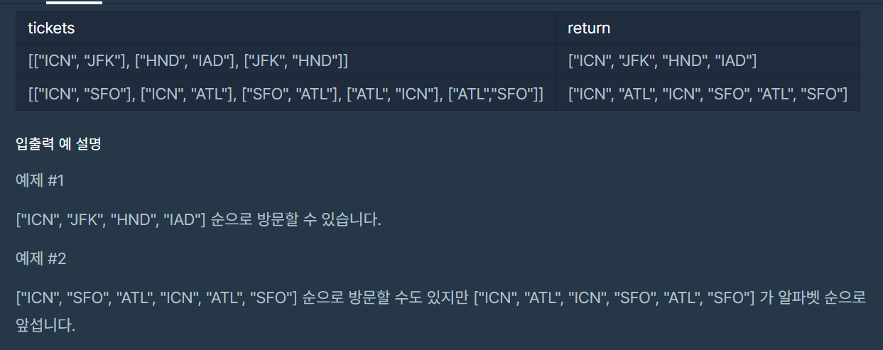 https://leetcode.com/problems/reconstruct-itinerary/description/ - [from,to]로 구성된 항공권 목록을 이용해 JEK에서 출발하는 여행 일정을 구성하라. 여러 일정이 있는 경우 사전 어휘순(Lexical Order)로 방문한