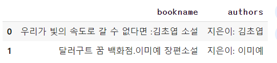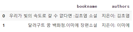 - loc 메서드의 첫 번째 매개변수로 행 인덱스 0과 1을 리스트로 전달하고 두 번째 매개변수로 열 이름 'bookname','authors'를 리스트로 전달