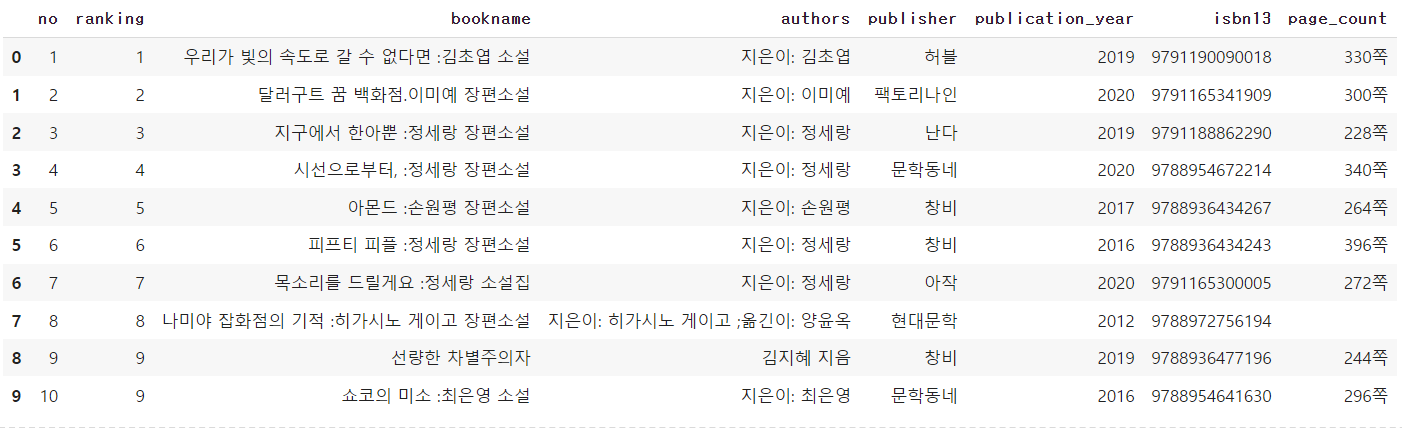 - 가장 인기 있는 10권의 도서의 쪽수를 가져오기 위해 head() 함수로 10개 행만 가져와 데이터프레임을 만든다.