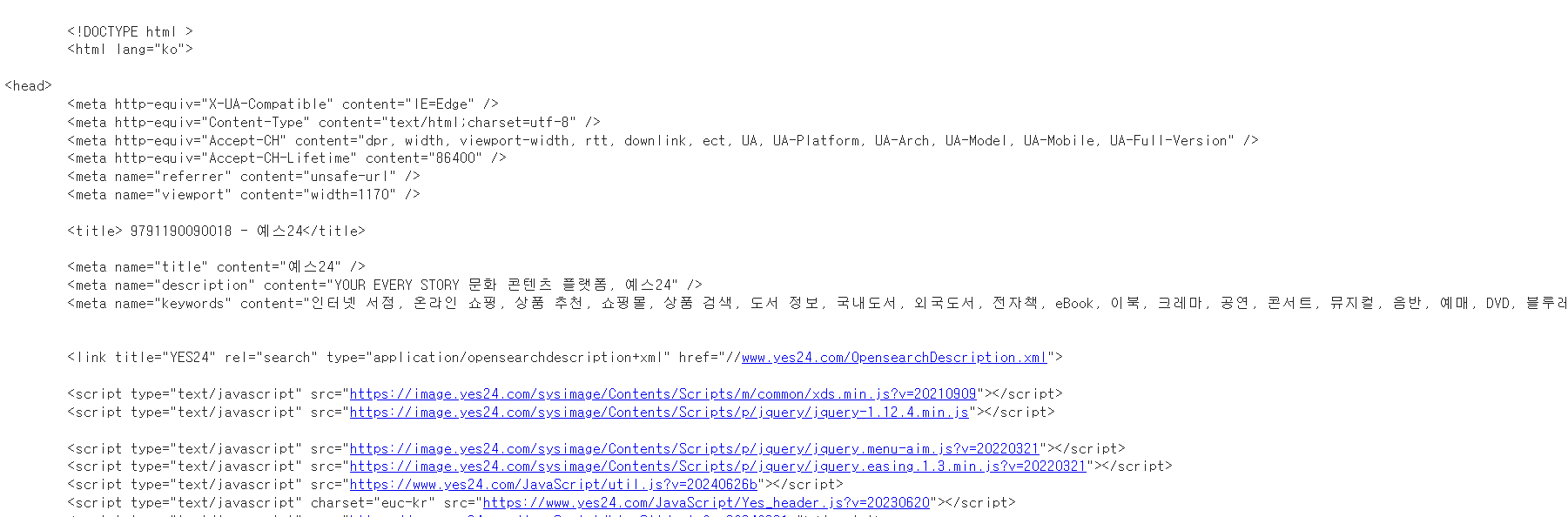 - requests 패키지를 임포트하고 request.get() 함수로 첫 번째 도서에 대한 검색 결과 페이지 HTML 가져오기