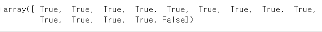 - 비교 연산자를 활용해 원하는 행은 True로 표시하고 제외할 행은 False로 표시한 불리언 배열을 만들어 사용