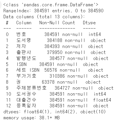 - 앞으로 어떤 도서가 인기 있을지 예상하려고 하므로 이 데이터프레임에서 '대출건수' 열이 중요하다. 따라서 도서의 대출건수는 하나로 합치는 것이 좋다.