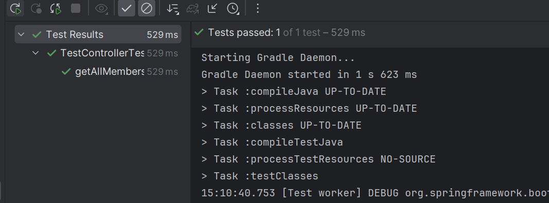 - TestController에서 만든 API는 응답으로 OK(200)을 반환하므로 이에 해당하는 메서드인 isOK를 사용해 응답 코드가 OK(200)인지를 확인