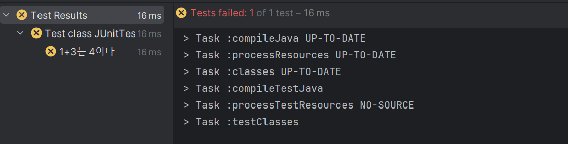 이렇게 JUnit은 테스트 케이스가 하나라도 실패하면 전체 테스트를 실패한 것으로 보여준다.