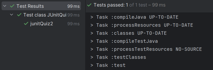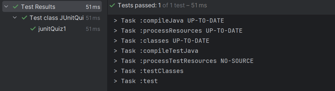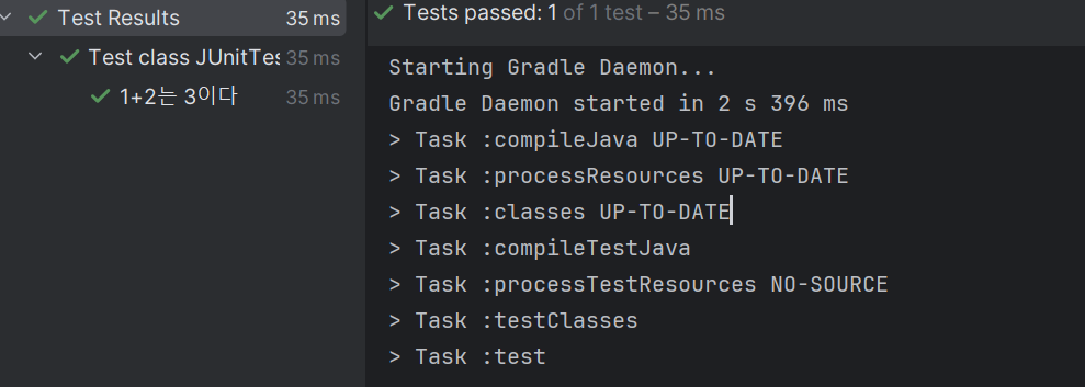 - 이 테스트에서는 JUnit에서 제공하는 검증 메서드인 assertEquals()로 a+b와 sum의 값이 같은지 확인한다.